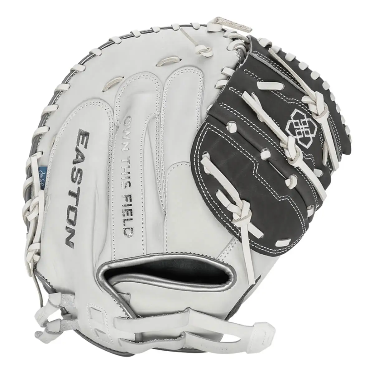 And it would be remiss of us if we didn’t note the touches of swagger that have been added to the mitt. You’ll notice in a few spots of the mitt (both sides of the web, catching palm & hand slot) that Jen Schroeder’s personal logo has been added. Also, Easton placed the quote “Own This Field” on the mitt’s backing so that ladies wearing the mitt know to take charge from the backstop!